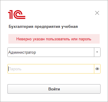17. Вопрос: Установили учебную версию 1С:Бухгалтерии, но при попытке входа от имени администратора выходит ошибка "Неверно указан пользователь или пароль". Насколько знаю, в учебной версии нет возможности использования паролей. Как войти программу?