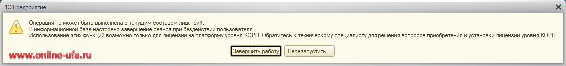 Вопрос 3: Хотели проверить функцию автоматического завершения сеансов при бездействии пользователей на рабочей базе. Оказалось, что она требует лицензию на сервер 1С:Предприятия 8 уровня КОРП и теперь невозможно запустить базу, ни Конфигуратором, ни в режиме 1С:Предприятие - при запуске выходит ошибка: