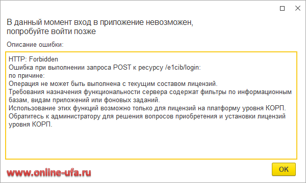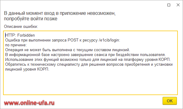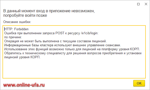 HTTP: Forbidden Ошибка при выполнении запроса POST к ресурсу /e1cib/login: по причине: Операция не может быть выполнена с текущим составом лицензий. Информационные базы кластера используют внешнее управление сеансами. Использование этих функций возможно только для лицензий на платформу уровня КОРП. Обратитесь к администратору для решения вопросов приобретения и установки лицензий уровня КОРП.