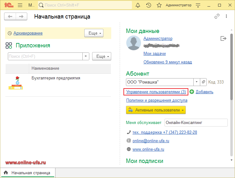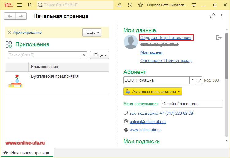 Один пользователь, например, обслуживающий бухгалтер, под своей учетной записью может работать с информационными базами сразу нескольких разных абонентов. При этом все доступные информационные базы этих абонентов будут одновременно отображаться у бухгалтера на странице "Мои приложения" и в "Личном кабинете".