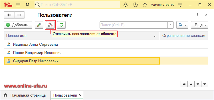 Администратор абонента может отключить от абонента только обычных пользователей, но не может отключить пользователей с ролью "Владельц абонента" и других администраторов.