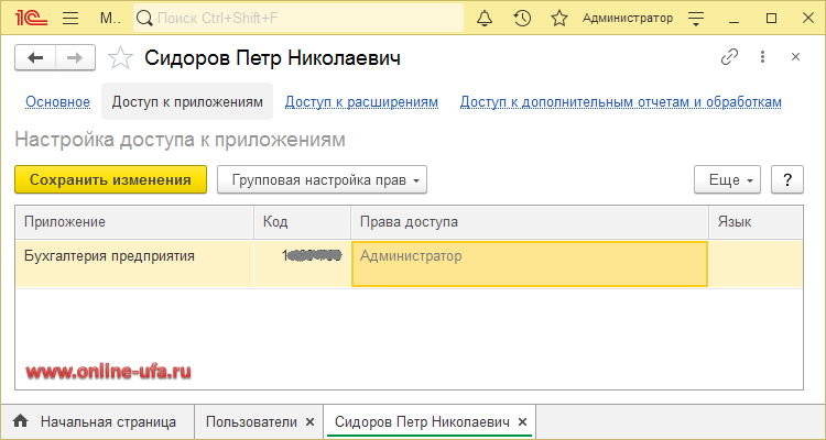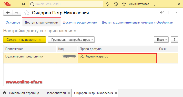 В списке "Пользователи" откройте карточку нужного пользователя и перейдите на закладку "Доступ к приложениям".