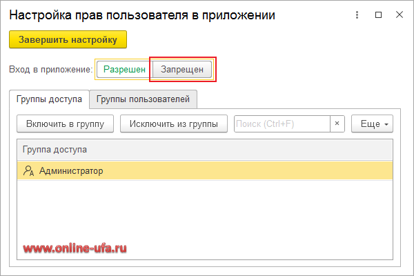 В окне "Настройка прав пользователя приложения" нажмите на кнопку "Запрещен" в поле "Вход в приложение:" и сохраните изменения нажав на кнопку "Завершить настройку".