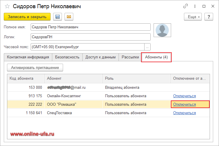 Ответ: Если в вашей карточке пользователя на закладке "Абоненты" нет гиперссылки "Отключиться", то это значит, что вы являетесь единственным пользователем этого абонента с ролью "Владелец абонента" и в этом случае отключиться невозможно. Сначала вам необходимо передать права владельца другому пользователю этого абонента (такой пользователь должен быть обязательно с емайл), после этого можно будет отключить абонента от пользователя.