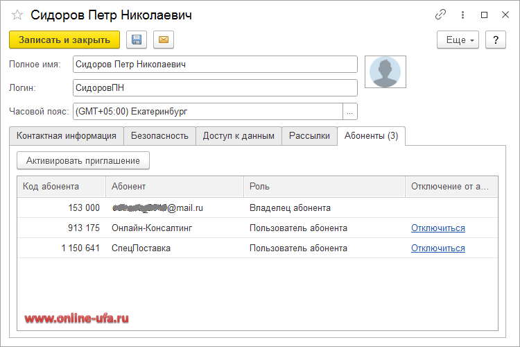 В открывшейся карточке пользователя облачного сервиса 1С:Фреш перейдите на закладку "Абоненты".