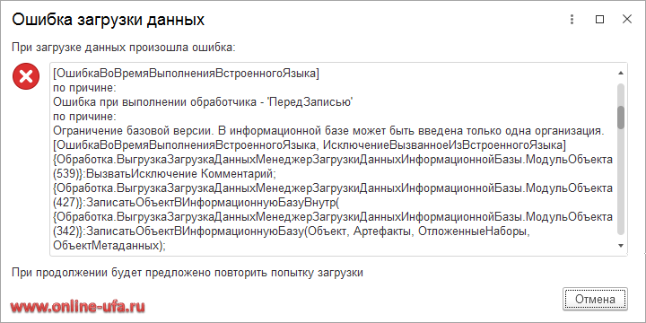 Ответ: Ошибка "Ограничение базовой версии. В информационной базе может быть введена только одна организация" говорит о том, что файл "data_dump.zip" был выгружен НЕ из БАЗОВОЙ версии. Т.е. в облаке у вас использовалась 1С:Бухгалтерия версии ПРОФ или КОРП, а не базовой. Но раз ошибка вышла после проверки версии конфигурации Базовая/ПРОФ/КОРП, которая происходит в самом начале загрузки, то значит, кто-то еще вручную "подшаманил" идентификатор конфигурации перед загрузкой. Из такого файла нельзя загрузить данные в базовую версию 1С:Бухгалтерии, никакие манипуляции с файлом data_dump.zip в этом случае не помогут. Загрузить на локальном ПК можно будет только из изначального файла выгрузки data_dump.zip до манипуляций и только в случае, если локально будет установлена точно такая же версия конфигурации "Бухгалтерия предприятия" версии ПРОФ или КОРП. Узнать точную версию конфигурации, которую необходимо установить для возможности загрузки, можно из файла DampInfo.xml.
